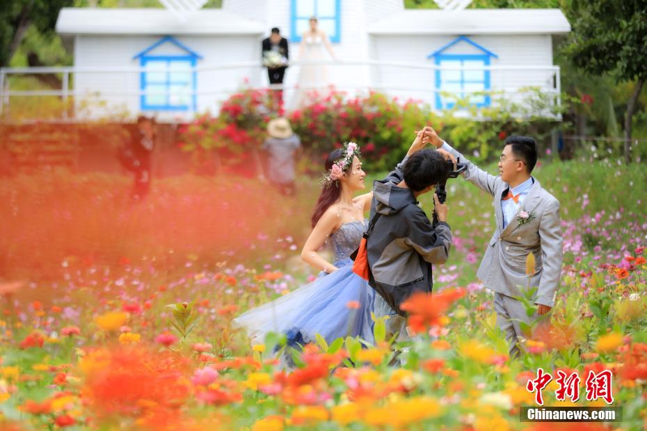 春暖花開,來自全國各地的婚拍游客在天涯海角游覽區(qū)內拍攝婚紗照。 范勇 攝