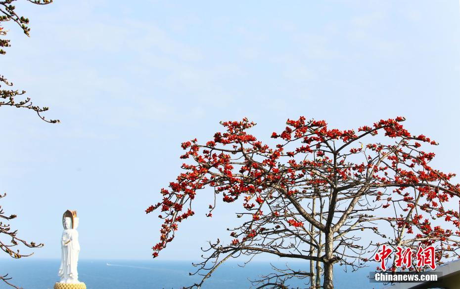 三亞南山景區(qū),盛開(kāi)的木棉花與碧海藍(lán)天及海上觀音像相映。 陳文武 攝