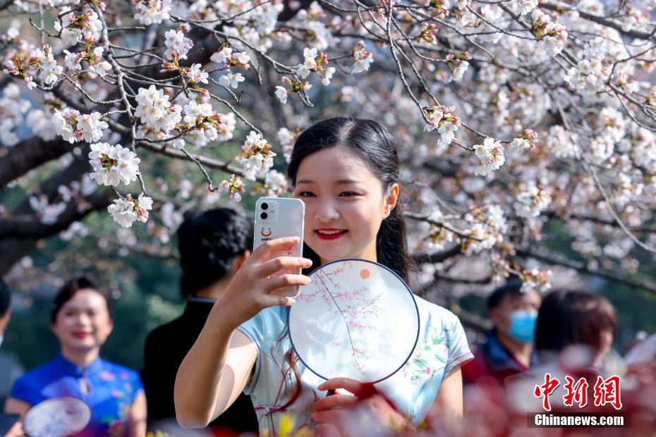3月4日,一位身著旗袍的女士在盛開的櫻花下自拍。近日,武漢大學(xué)櫻花大道、鯤鵬廣場(chǎng)等處的櫻花陸續(xù)綻放。中新社記者 張暢 攝