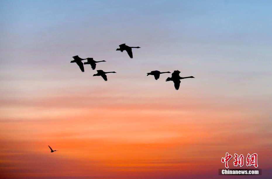 3月3日, 大批天鵝從山東省榮成市大天鵝自然保護(hù)區(qū)起飛,越過濕地和山脈向西北方向飛去。據(jù)了解,每年10月下旬,大批天鵝從北方遷徙到山東省榮成市成山天鵝湖和石島灣等地棲息,目前天鵝已經(jīng)回遷過半。中新社發(fā) 楊志禮 攝 圖片來源:cnsphoto