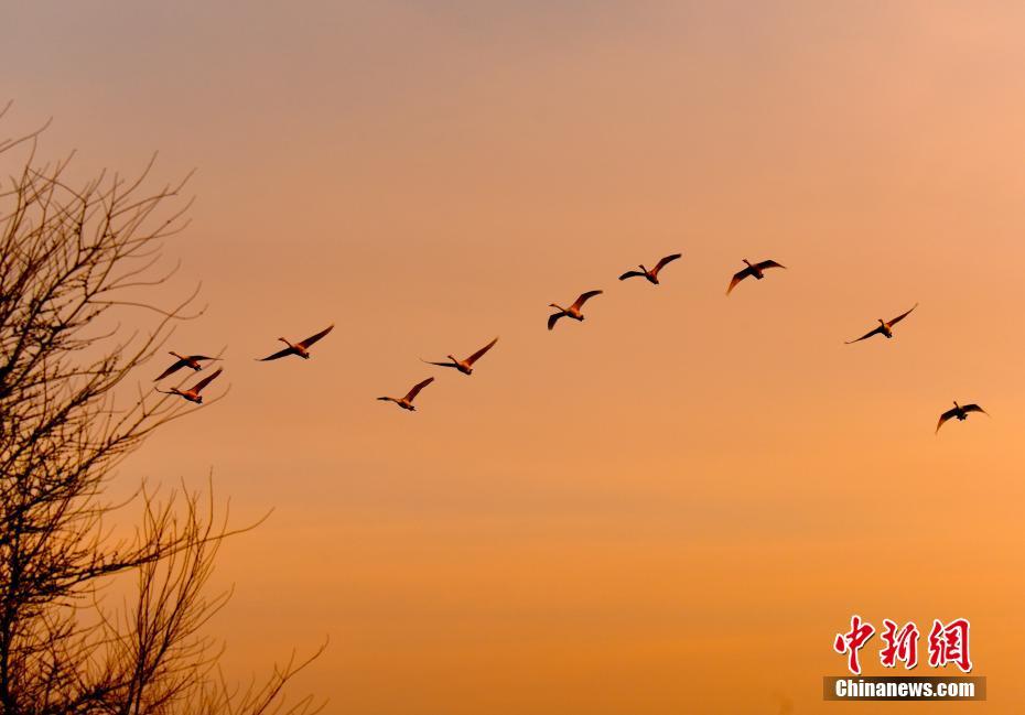 3月3日, 大批天鵝從山東省榮成市大天鵝自然保護區(qū)起飛,越過濕地和山脈向西北方向飛去。據了解,每年10月下旬,大批天鵝從北方遷徙到山東省榮成市成山天鵝湖和石島灣等地棲息,目前天鵝已經回遷過半。中新社發(fā) 楊志禮 攝 圖片來源:cnsphoto