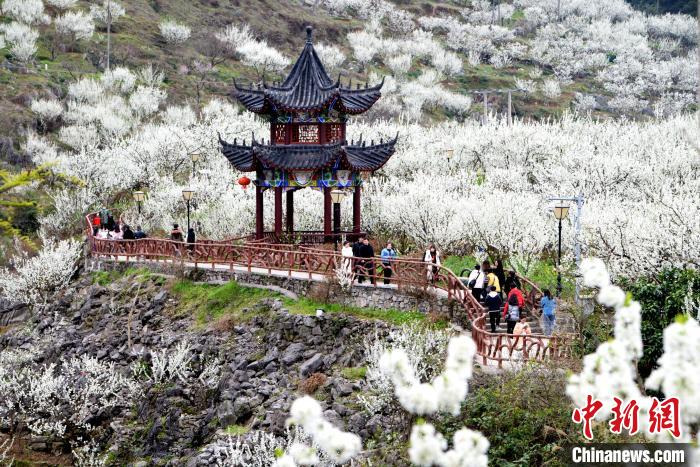 “春國送暖百花開,李花怒放一樹白”。6日,貴州·沿河第十一屆李花節(jié)在國家3A級旅游景區(qū)南莊村開幕,數(shù)萬畝李花相繼盛開喜迎八方游客。漫山遍野的李子樹“銀裝素裹”,一簇簇李花潔白相映,三五成群的游客漫步其中,駐足拍照,亦或盡情享受春花燦漫的美景。截至目前,沿河土家族自治縣空心李產(chǎn)業(yè)面積9.28萬畝,投產(chǎn)面積4.8萬畝,遠銷北京、上海、蘇州等地,并成為帶動當?shù)卮迕裰赂辉鍪盏奶厣r(nóng)業(yè)支柱產(chǎn)業(yè)之一。