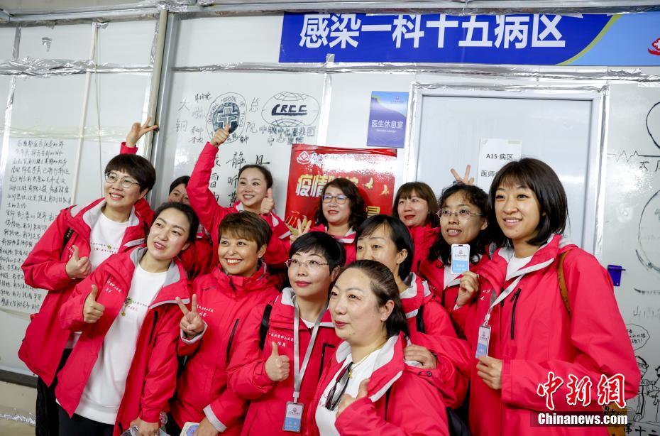 圖為援鄂醫(yī)護(hù)人員在曾經(jīng)工作過的病區(qū)合影。 中新社記者 張暢 攝