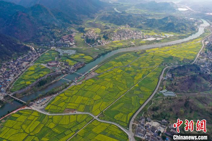 3月17日,貴州省黔南布依族苗族自治州貴定縣盤江鎮(zhèn)金海雪山景區(qū)綻放的萬畝油菜花吸引游客前來游覽、拍照。瞿宏倫 攝