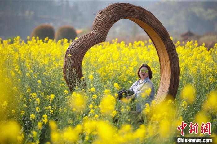 游客在油菜花田內(nèi)的心型景觀前留影。 瞿宏倫 攝