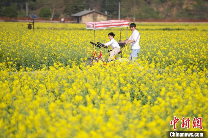 游客在油菜花田內(nèi)騎行雙人自行車!■暮陚 攝