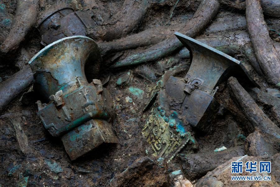 這是在三星堆遺址考古發(fā)掘現(xiàn)場3號“祭祀坑”內(nèi)拍攝的青銅器和象牙(3月16日攝)。 3月20日,在四川省成都市舉行的“考古中國”重大項目工作進展會上,記者獲悉,考古工作者在三星堆遺址新發(fā)現(xiàn)的6座三星堆文化“祭祀坑”,目前已出土重要文物500余件。 新華社記者 沈伯韓 攝