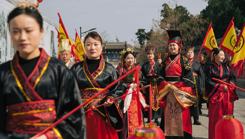 4月5日,正值清明假期,鄒魯文化公司組織的一場漢式周制婚禮展演在千年孟府舉行,展現(xiàn)了傳統(tǒng)文化之美。當天,伴隨著古樸典雅的音樂,一對新人身穿漢式婚服,在執(zhí)事的引導(dǎo)下,遵循古禮,步入典禮現(xiàn)場。在贊禮官的帶領(lǐng)下,兩位新人重現(xiàn)經(jīng)典的漢式婚禮,互行沃盥、對席、同牢、合巹、解纓、結(jié)發(fā)、拜叩等有著獨特寓意的婚典禮儀。該展演活動秉承“著我漢家衣裳,興我禮義之邦”的理念,以漢服為載體,傳承發(fā)揚傳統(tǒng)婚俗文化。鄒魯文化供圖