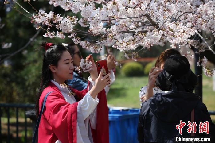 山東青島:清明假期櫻花盛放 引數(shù)十萬游客賞櫻游園(2)