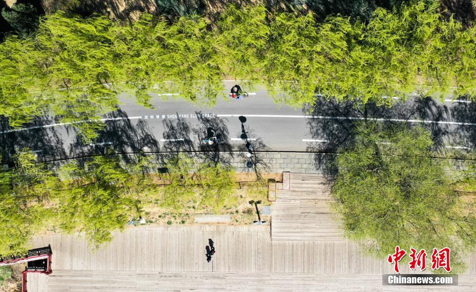 4月13日,遼寧沈陽沈水灣公園,樹木吐綠、春意盎然。圖為航拍游客在沈水灣公園游玩。中新社記者 于海洋 攝