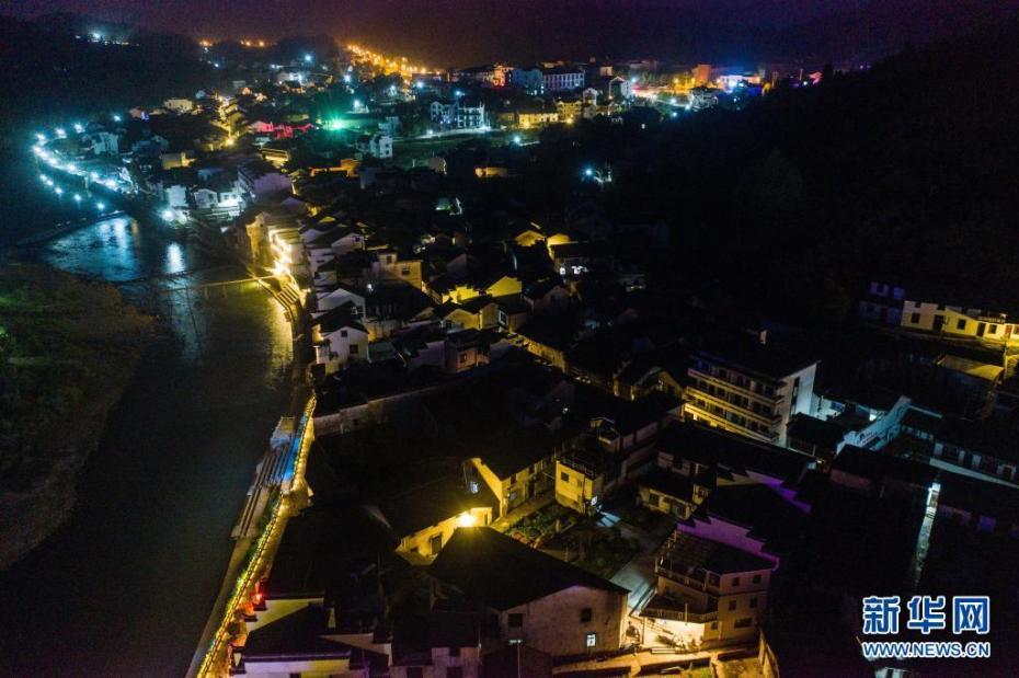 4月17日,杭州市臨安區(qū)河橋古鎮(zhèn)的夜晚燈火闌珊(無人機(jī)照片)。新華社記者 徐昱 攝 圖片來源:新華網(wǎng)