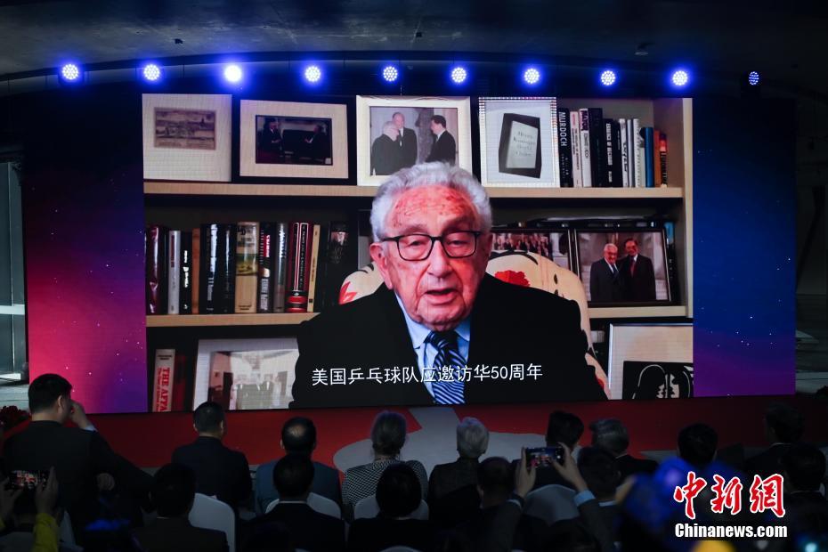 4月24日,紀(jì)念中美“乒乓外交”50周年活動(dòng)在北京舉行。圖為美國(guó)前國(guó)務(wù)卿基辛格通過(guò)視頻致辭。 中新社記者 張興龍 攝