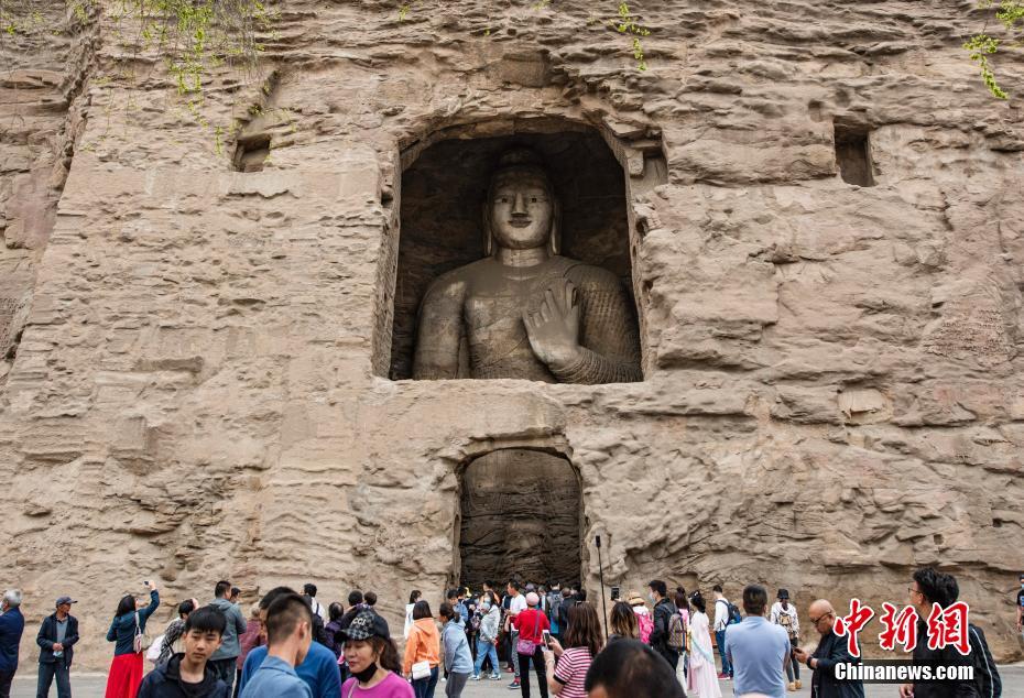 5月3日,“五一”假期第三天,游客在山西省大同市參觀世界文化遺產(chǎn)——云岡石窟。 中新社記者 侯宇 攝