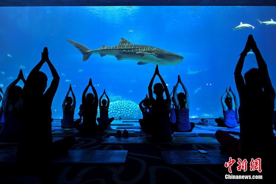 5月9日,廣東省珠海市,數(shù)十名媽媽在長隆海洋王國的鯨鯊館內(nèi)參加“潮媽”瑜伽活動,歡度母親節(jié)。 中新社記者 陳驥旻 攝