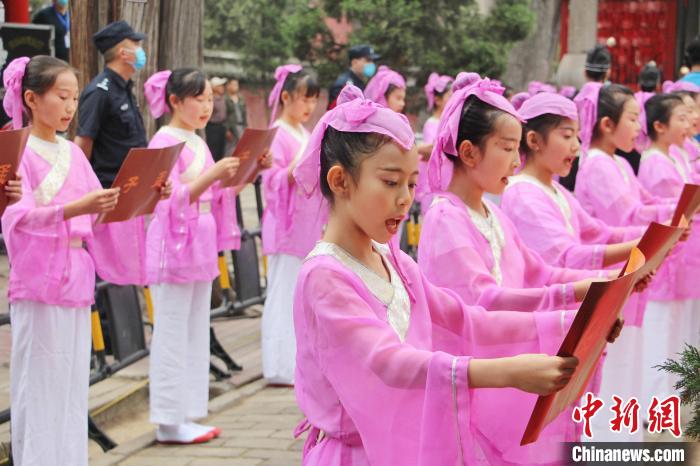 身著古代服飾的小學(xué)生誦讀孟子名言!≮w曉 攝