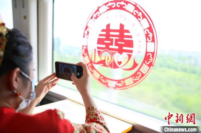 “天地為證,親友為鑒,我們自愿結(jié)為夫妻!5月20日,鄭州北郊風和日麗,景秀宜人,28對新人共持手寫婚書,在愛的誓言中,邁入婚姻的殿堂。臺下,60余位新人,家屬、青年職工共同見證了這幸福的時刻。這一喜慶場面,是中國鐵路鄭州局集團有限公司為管內(nèi)職工舉行的第十五屆青年集體婚禮現(xiàn)場。(闞力)圖為參加集體婚禮的新人在動車組列車上拍照留念!⊥跽聩i 攝