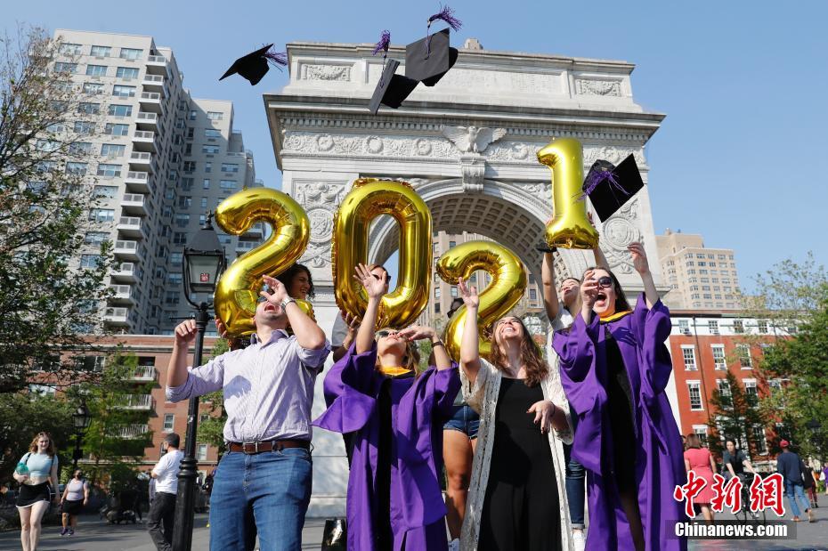 當?shù)貢r間5月19日,美國紐約大學的畢業(yè)生在曼哈頓華盛頓廣場歡慶畢業(yè)時刻。 中新社記者 廖攀 攝