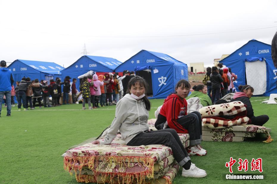 5月22日,在青海省果洛藏族自治州瑪多縣黃河鄉(xiāng)藏文寄宿制學(xué)校安置點內(nèi),學(xué)生坐在床墊上等待入住救災(zāi)帳篷。 中新社記者 馬銘言 攝