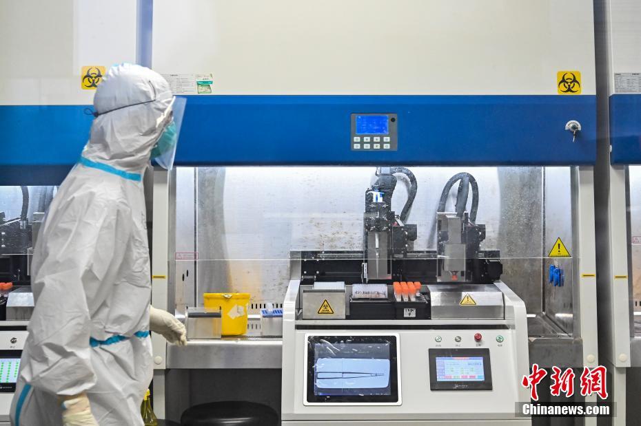 5月31日,廣東省廣州市,金域醫(yī)學(xué)總部實(shí)驗(yàn)室工作人員在檢測核酸樣本。該醫(yī)學(xué)檢驗(yàn)機(jī)構(gòu)作為核酸樣本的第三方檢測機(jī)構(gòu),自5月21日起承接廣州荔灣區(qū)核酸樣本檢測任務(wù),目前還承擔(dān)廣州海珠區(qū)、越秀區(qū)、番禺區(qū)、南沙區(qū)以及佛山、深圳大篩查核酸樣本檢測。截至5月30日,該醫(yī)學(xué)檢驗(yàn)機(jī)構(gòu)已完成此輪疫情核酸檢測超118萬人份,檢測結(jié)果已全部出具。 中新社記者 陳驥旻 攝