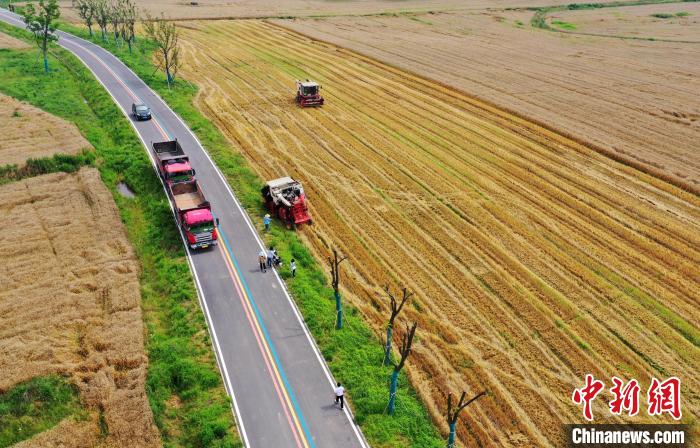 6月1日,安徽省合肥市蜀山區(qū)小廟鎮(zhèn)2.4萬畝小麥已經(jīng)成熟,現(xiàn)場麥浪滾滾、一片金黃,大型收割機搶抓晴好有利天氣收割小麥,確保顆粒歸倉。 “三夏”時節(jié),安徽各地麥?zhǔn)者M入高峰期。6月1日,在合肥市蜀山區(qū)小廟鎮(zhèn)段沖村,農(nóng)機手操作機械設(shè)備收割小麥(無人機照片)!£惾 攝