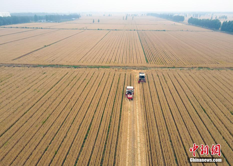 6月10日,山東曲阜王莊鎮(zhèn)李莊村種糧大戶宋德華、宋文新、宋紅林三兄弟用收割機(jī)搶收小麥。據(jù)了解,中國北方“三夏”生產(chǎn)進(jìn)入關(guān)鍵期,山東曲阜市農(nóng)業(yè)農(nóng)村局精心組織小麥機(jī)收會(huì)戰(zhàn),指導(dǎo)農(nóng)民搶抓農(nóng)時(shí),加快機(jī)收作業(yè)進(jìn)度,確保小麥顆粒歸倉。截至6月8日,曲阜全市2800余臺小麥聯(lián)合收割機(jī)紛紛走上夏收“戰(zhàn)場”,小麥已收割6.5萬畝,預(yù)計(jì)6月12日小麥?zhǔn)崭畲竺娣e完成。(無人機(jī)照片) 中新社記者 毛建軍 攝