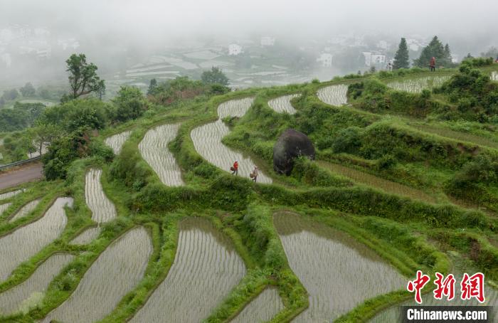 層層疊疊的水田如長龍蜿蜒曲折,在晨霧籠罩下,與遠(yuǎn)山、粉墻黛瓦的村落相互輝映!『鼗 攝