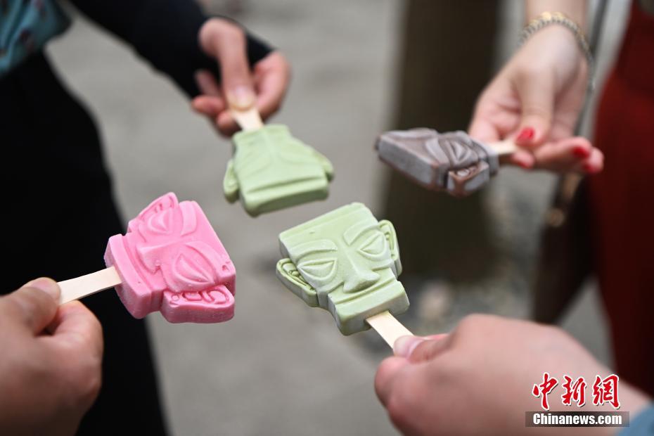 6月12日,四川廣漢,三星堆博物館以祭祀坑出土的青銅面具為原型打造的冰淇淋吸引游客。圖為游客購買的青銅面具冰淇淋。 中新社記者 安源 攝
