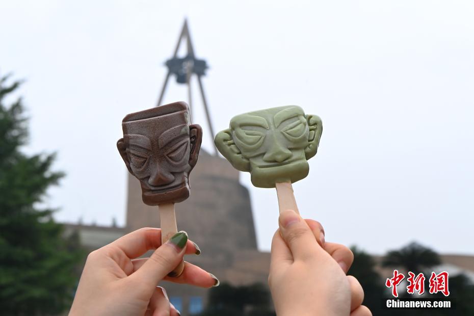 6月12日,四川廣漢,三星堆博物館以祭祀坑出土的青銅面具為原型打造的冰淇淋吸引游客。圖為游客購買的青銅面具冰淇淋。 中新社記者 安源 攝
