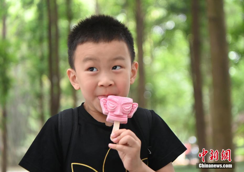 6月12日,四川廣漢,三星堆博物館以祭祀坑出土的青銅面具為原型打造的冰淇淋吸引游客。圖為游客購買的青銅面具冰淇淋。 中新社記者 安源 攝