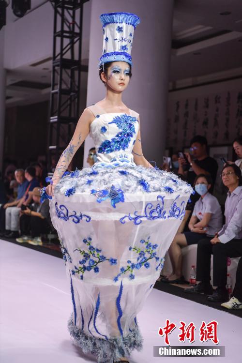 6月22日晚,山東工藝美術(shù)學(xué)院設(shè)計(jì)·生活2021時(shí)尚發(fā)布會(huì)在山東濟(jì)南上演。學(xué)生們設(shè)計(jì)、制作的90余套作品參展。圖為山東工藝美術(shù)學(xué)院表演專業(yè)的學(xué)生展示服裝。 中新社記者 張勇 攝