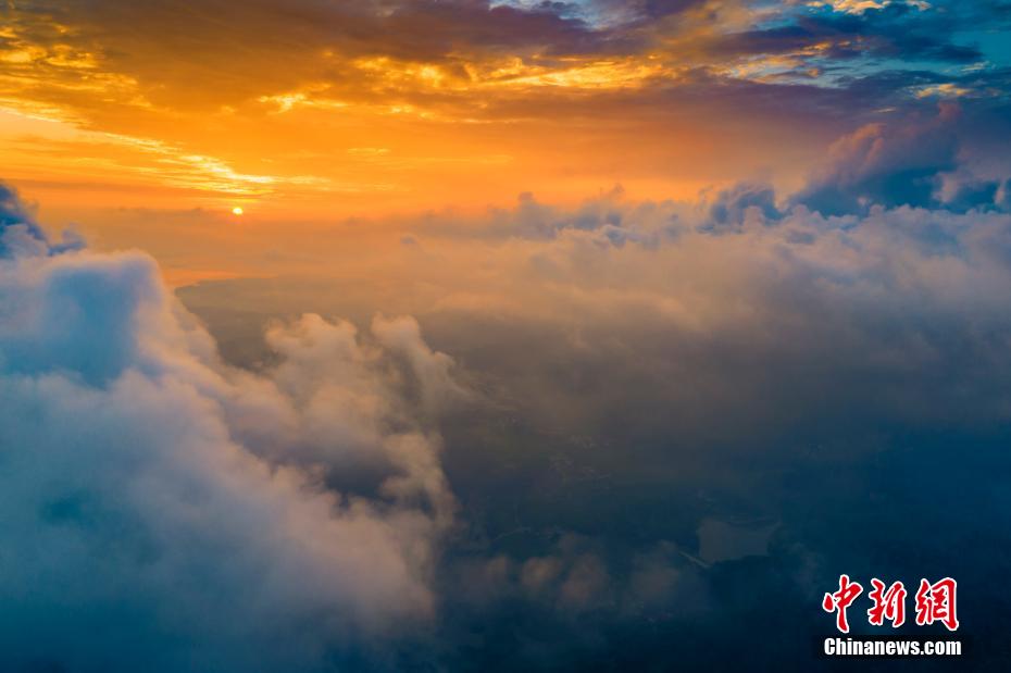航拍江西省九江市天花井國(guó)家森林公園。旭日從鄱陽(yáng)湖冉冉升起,云海翻騰、朝霞滿(mǎn)天,景色壯美。 祝興勇 攝