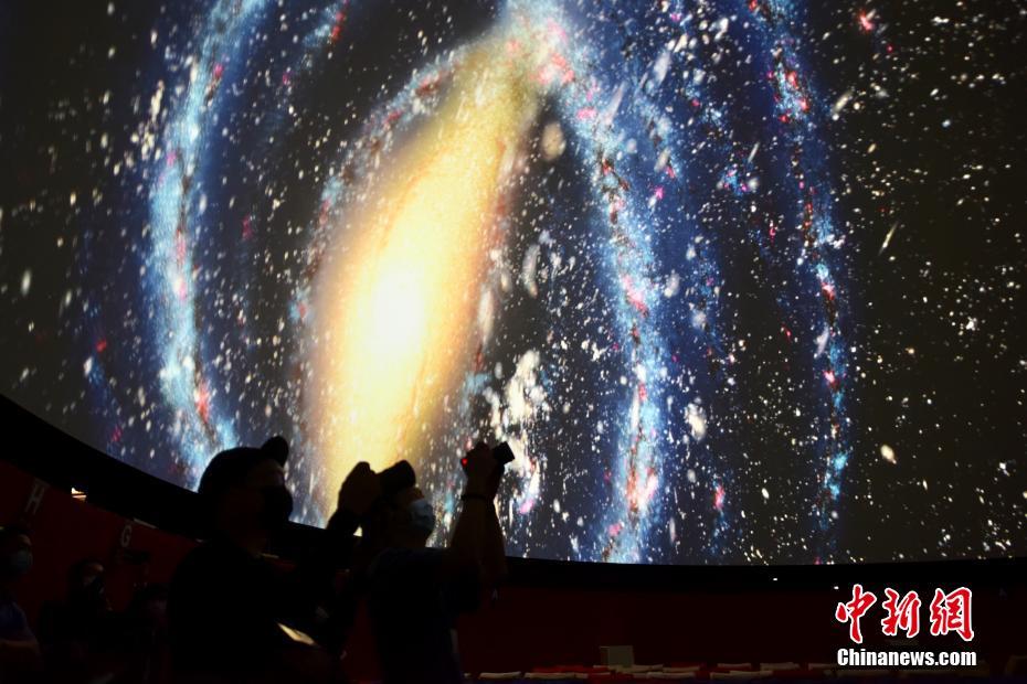 香港太空館天象廳經(jīng)過(guò)翻新工程后, 將于7月1日重開,翻新工程主要更換直徑達(dá)23米的半球形屏幕,并以無(wú)縫拼接為觀眾帶來(lái)更清晰亮麗的體驗(yàn)。6月29日下午,香港太空館館長(zhǎng)李為君介紹天象廳全新設(shè)施,并播放新天象節(jié)目作示范。圖為現(xiàn)場(chǎng)人士觀看新天象節(jié)目。 中新社記者 李志華 攝