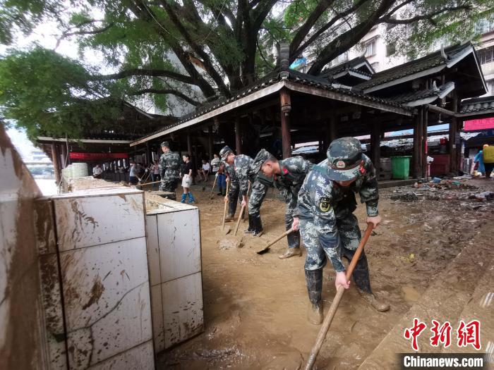 7月2日,任務(wù)官兵前往受災(zāi)嚴(yán)重的農(nóng)貿(mào)市場,與當(dāng)?shù)馗刹、群眾進行緊急清淤!《悍 攝