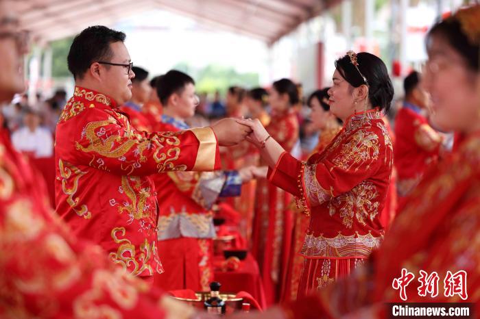 百位新人身著華美中式禮服參加傳統(tǒng)婚典禮儀!≈x琛 攝