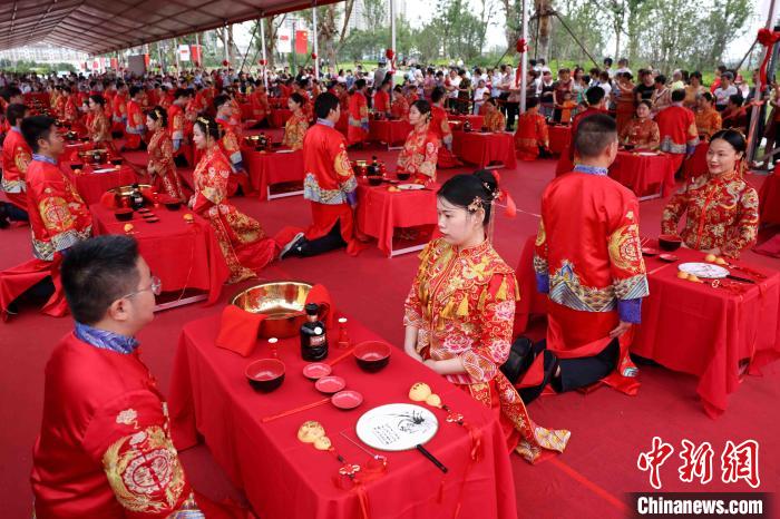 百位新人身著華美中式禮服參加傳統(tǒng)婚典禮儀!≈x琛 攝