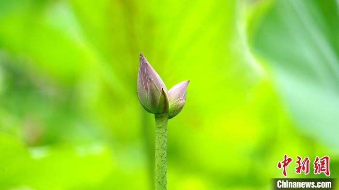 “藕花深處田田葉,葉上初生并蒂蓮!苯眨谏綎|濟(jì)南大明湖畔南豐祠雨荷廳前的荷花池里出現(xiàn)一株并蒂蓮,目前還處于生長(zhǎng)期,距開花大約還需要一周的時(shí)間。孫婷婷 攝
