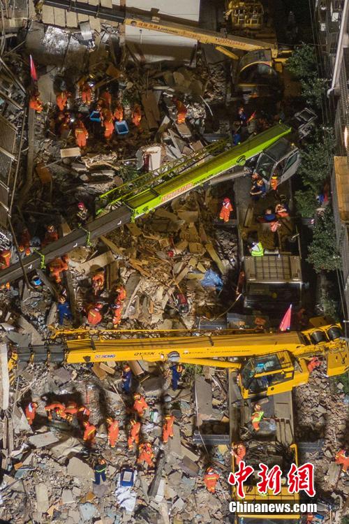 圖為消防員正在塌樓事故現(xiàn)場(chǎng)救援。 泱波 攝