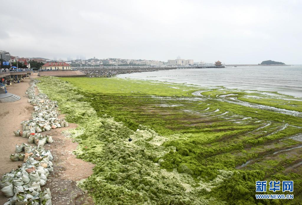 位于青島著名景點棧橋附近的青島第六海水浴場因滸苔暫時關閉(7月17日攝)。新華社記者 李紫恒 攝