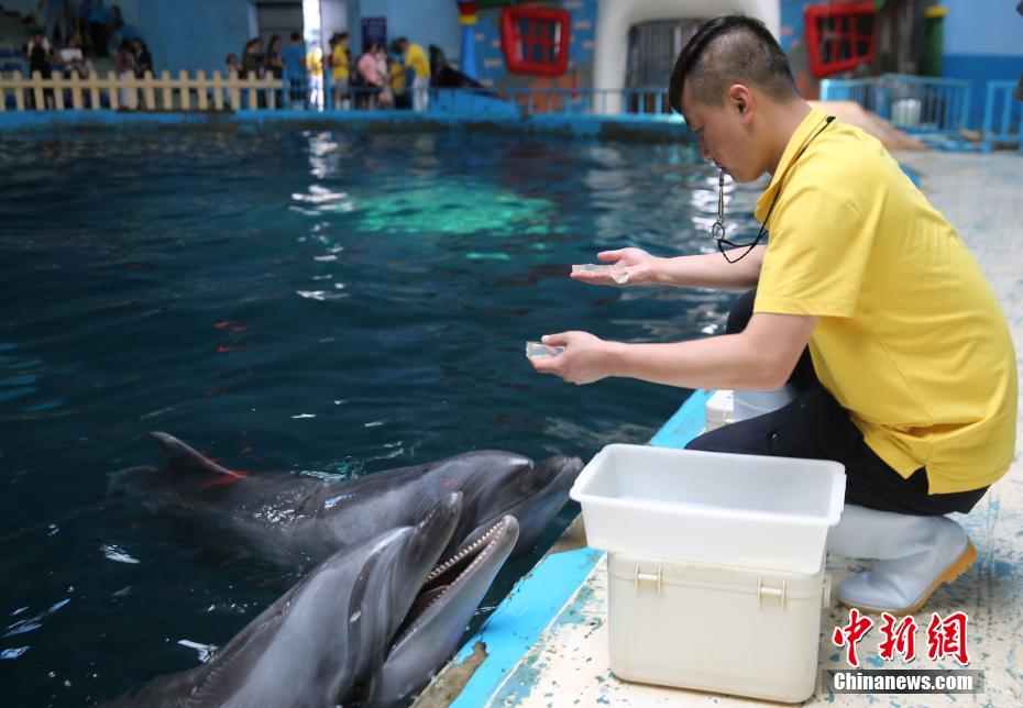 7月19日,在山東蓬萊海洋極地世界,海豚吃著“魚(yú)肉果凍”,北極熊啃著冰鎮(zhèn)蔬果,海象趴在“冰桌”上享用大餐!叭臁睂(duì)極地動(dòng)物們也是一場(chǎng)考驗(yàn),該海洋館啟動(dòng)控溫、維生、水循環(huán)及制冷系統(tǒng),并為動(dòng)物們量身打造各種避暑小妙方,幫助海洋動(dòng)物們避暑。隋新 攝