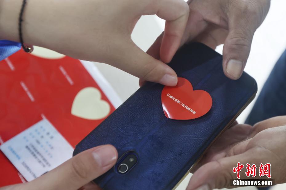 工作人員給做好核酸檢測的市民手機貼上“小紅心”。 泱波 攝