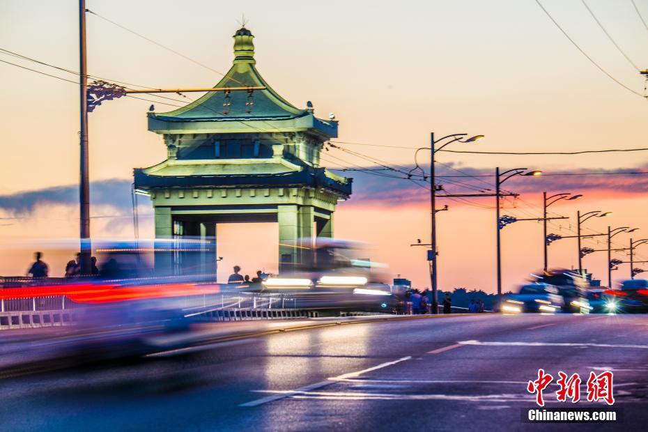 7月25日傍晚,晚霞下的武漢長江大橋車流不息,游客走上大橋上欣賞長江四岸的美景。中新社發(fā) 趙廣亮 攝 圖片來源:CNSPHOTO