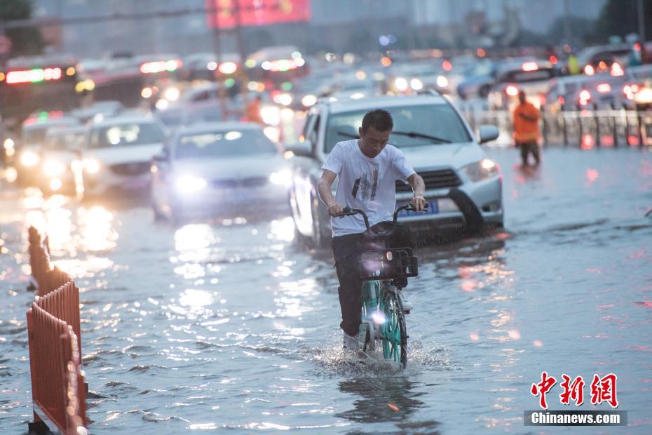 7月28日,山西太原突降暴雨,城市主干道迎澤大街產(chǎn)生大量積水,市民蹚水而行。 中新社記者 武俊杰 攝