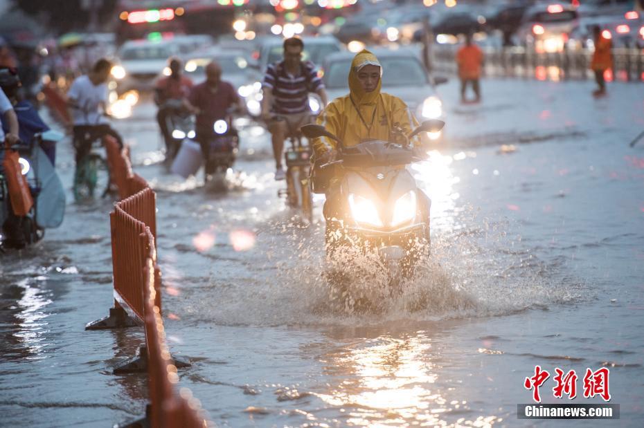 7月28日,山西太原突降暴雨,城市主干道迎澤大街產(chǎn)生大量積水,市民蹚水而行。 中新社記者 武俊杰 攝