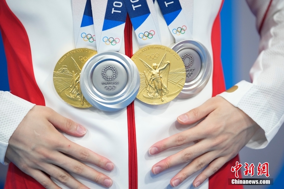 當(dāng)?shù)貢r(shí)間8月1日,東京奧運(yùn)會(huì)游泳比賽全部結(jié)束,張雨霏在游泳館展示自己的四塊獎(jiǎng)牌,拍照留念。本屆奧運(yùn)會(huì),張雨霏游了12槍共收獲了2金2銀,是當(dāng)之無(wú)愧的“勞!。中新社記者 杜洋 攝