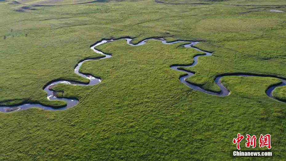 近日,狼渡灘濕地草原上九曲十八彎的溪流小河宛如流動的飄帶,縈繞在這片曾被喻為“苦甲天下”的土地上。王金生 攝