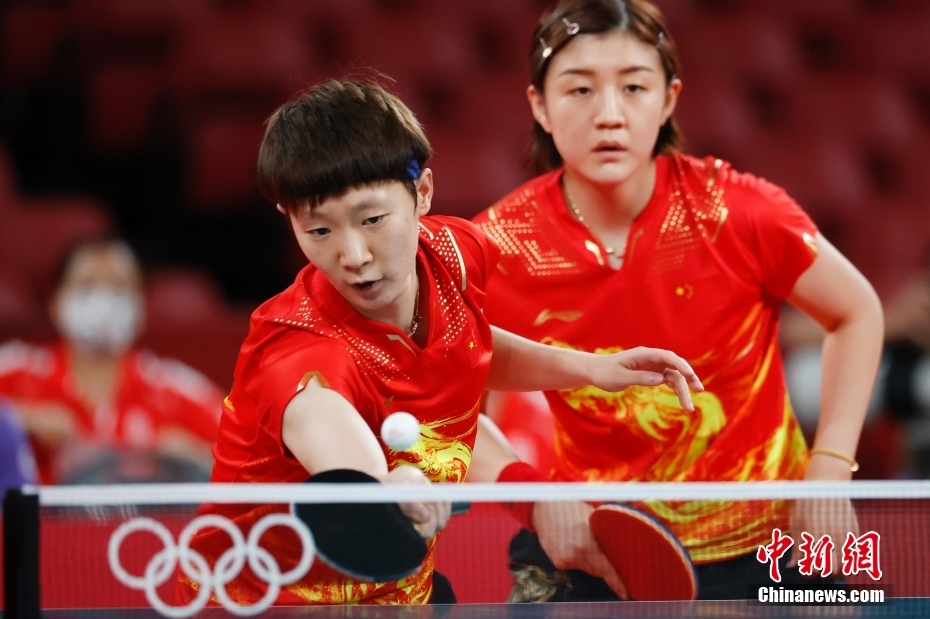 8月3日,中國(guó)隊(duì)球員陳夢(mèng)/王曼昱(左)在比賽中。當(dāng)日,東京奧運(yùn)會(huì)舉行乒乓球女子團(tuán)體比賽,中國(guó)隊(duì)?wèi)?zhàn)勝新加坡隊(duì),晉級(jí)四強(qiáng)。中新社記者 韓海丹 攝