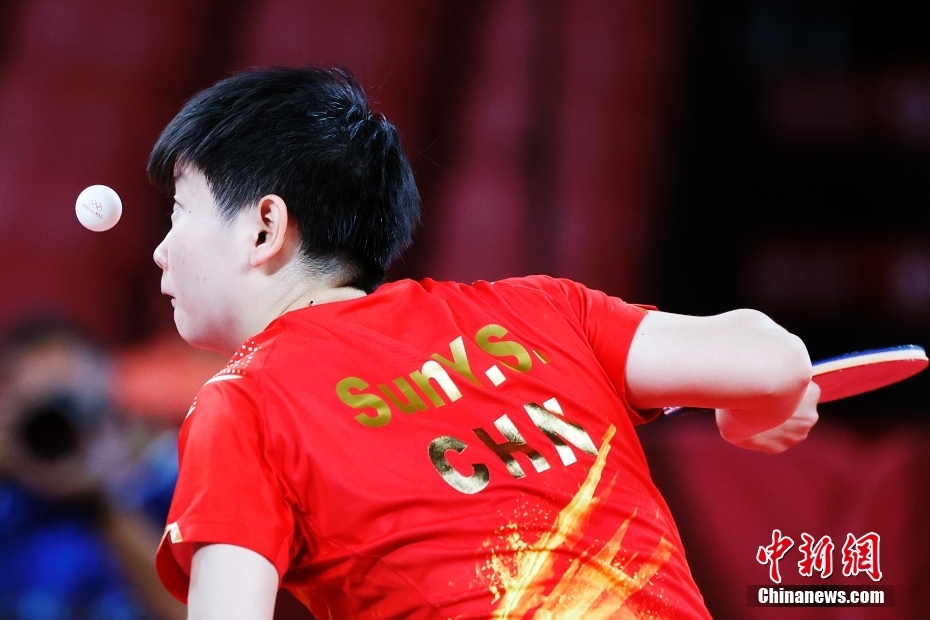 8月3日,中國隊(duì)球員孫穎莎在比賽中。當(dāng)日,東京奧運(yùn)會舉行乒乓球女子團(tuán)體比賽,中國隊(duì)?wèi)?zhàn)勝新加坡隊(duì),晉級四強(qiáng)。 中新社記者 韓海丹 攝