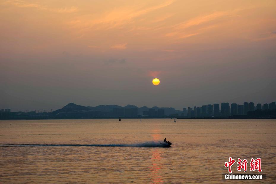 8月15日,山東青島西海岸新區(qū)靈山灣上空,夕陽和晚霞余暉映紅了海面。中新社發(fā) 韓加君 攝 圖片來源:CNSPHOTO