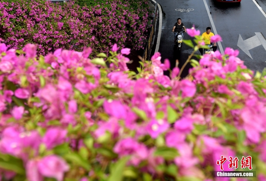 8月18日,福州人行過街天橋上的三角梅競相開放,美不勝收。 中新社記者 呂明 攝
