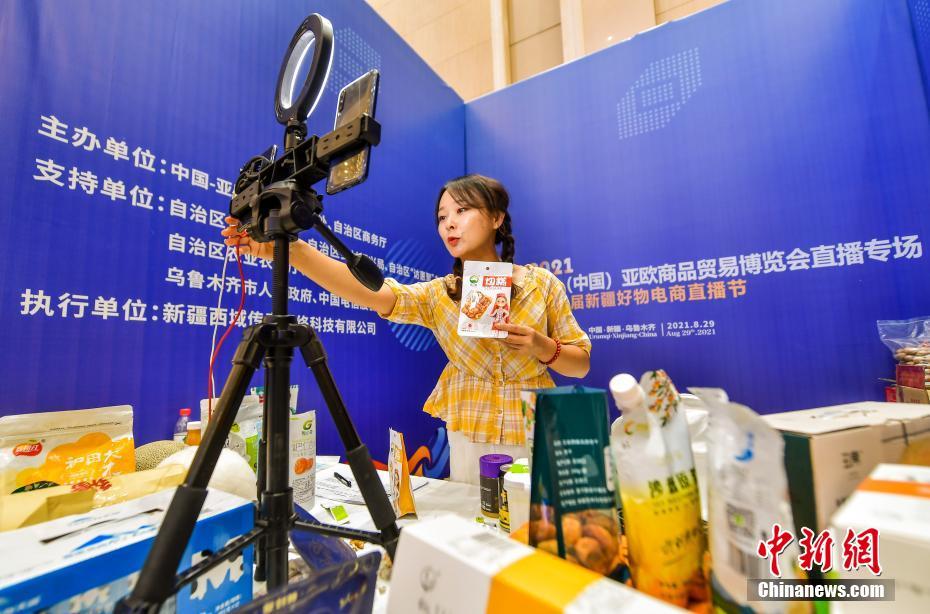 8月29日,2021線上亞歐商品貿(mào)易博覽會直播專場·第二屆新疆好物電商直播節(jié)在新疆烏魯木齊市舉辦,活動整合多個直播平臺,攜手當(dāng)紅頭部主播與新疆本地網(wǎng)紅線上帶貨,推動新疆農(nóng)特產(chǎn)品觸網(wǎng)上行,助力鄉(xiāng)村振興。圖為主播通過網(wǎng)絡(luò)平臺向網(wǎng)友推介新疆農(nóng)特產(chǎn)品。 中新社記者 劉新 攝